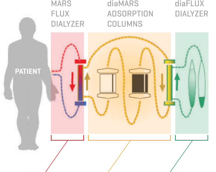 MARS is comprised of a blood circuit, an albumin circuit, and a classic CRRT circuit.14